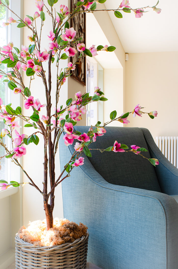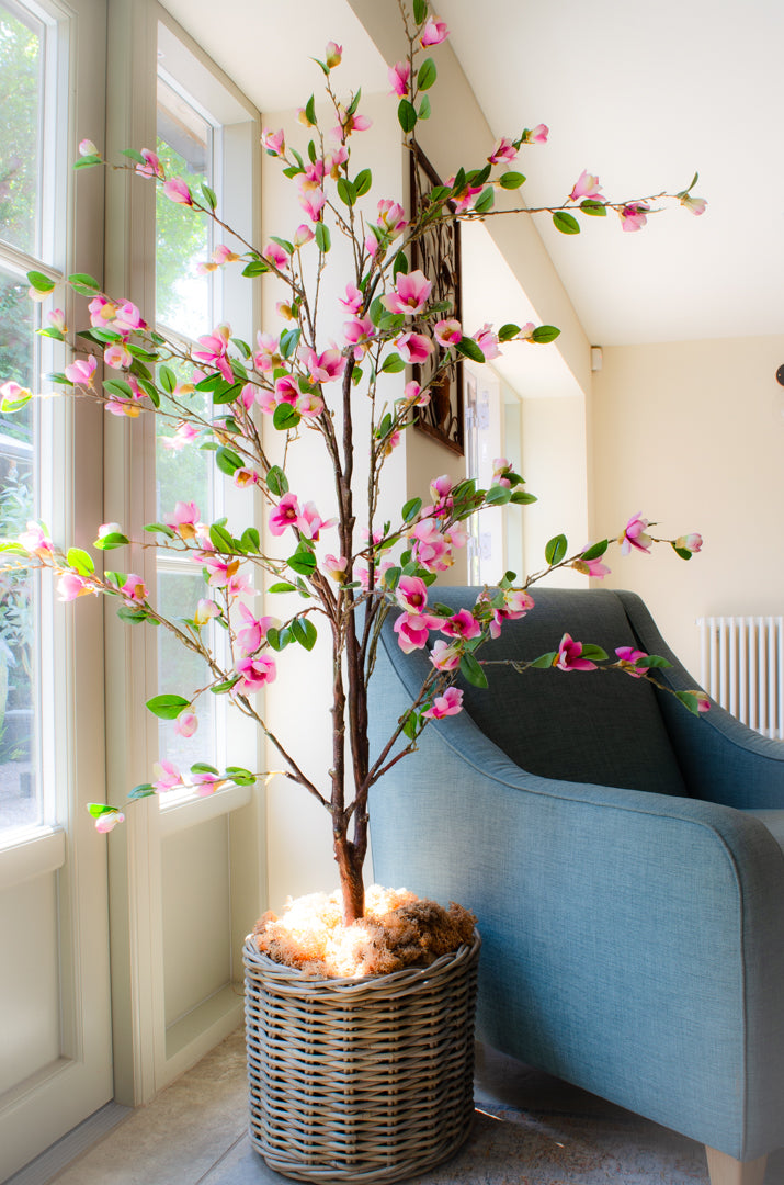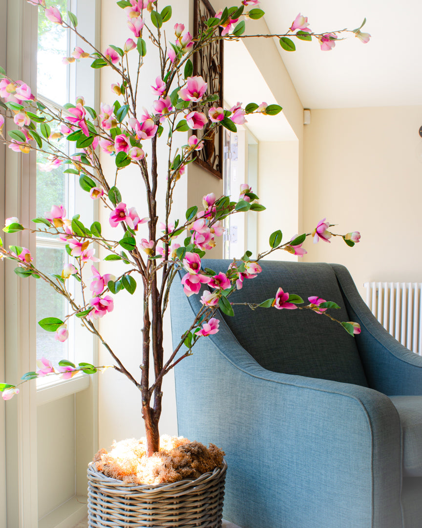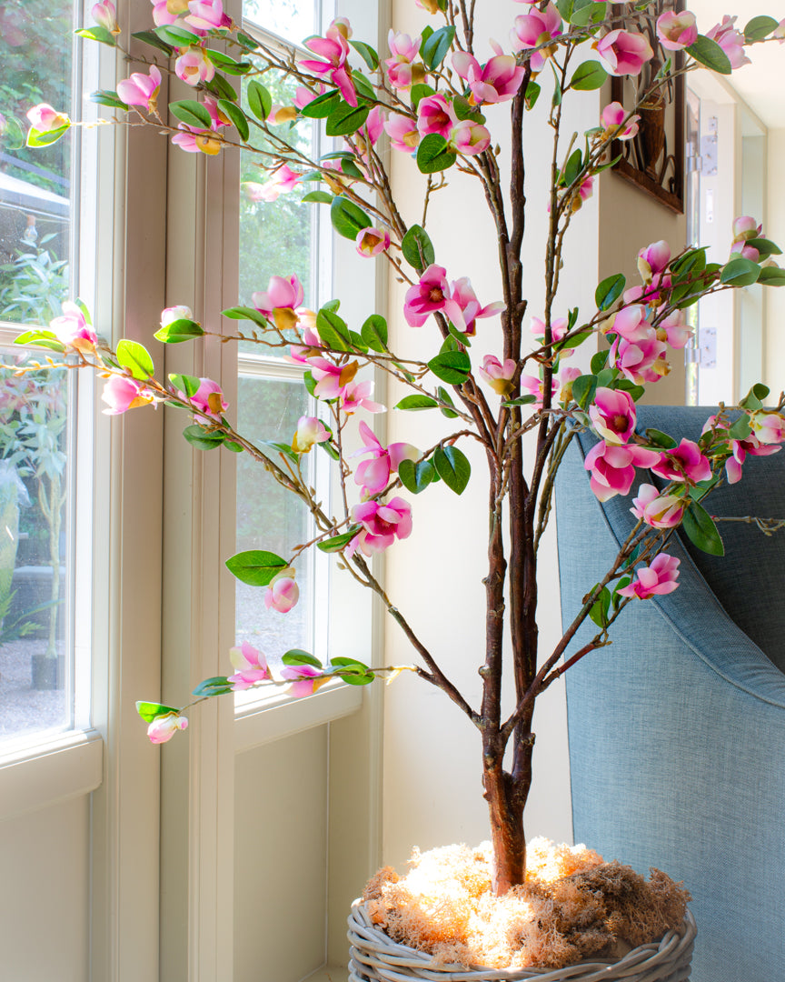A luxury artificial magnolia tree, adorned with hundreds of silk magnolia flowers and leaves. The whole tree is made from high quality materials for an exceptionally realistic tree, perfect for any room in your home. Indoors only, not suitable for outdoor use.