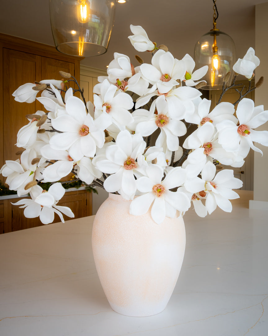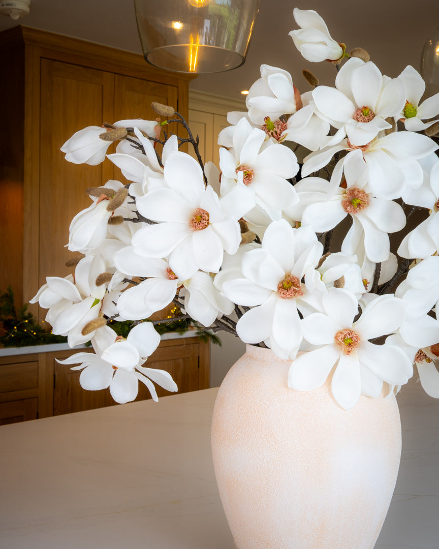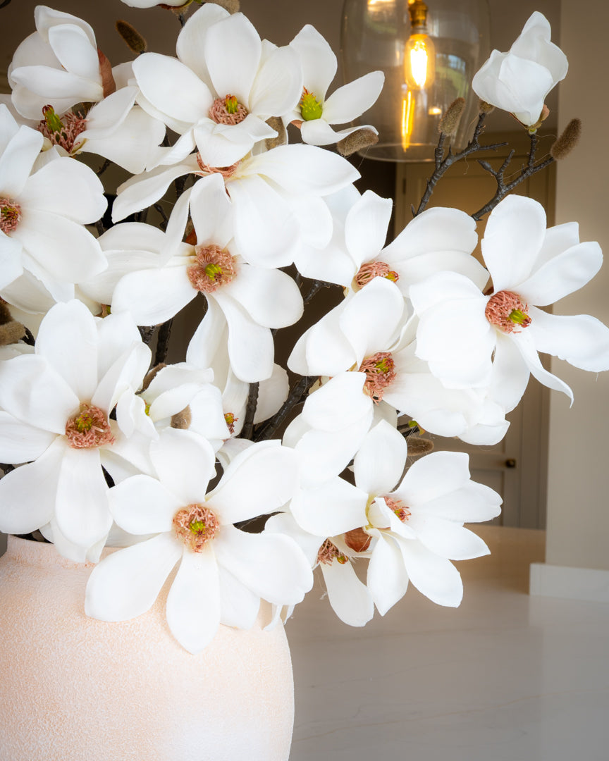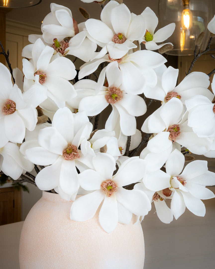 Wow, what a statement branch for winter and beyond! A stunning branch of realistic silk ivory magnolia grandiflora, adorned with flowers and real-touch buds. Style on their own in a vase or add the to a larger arrangement.